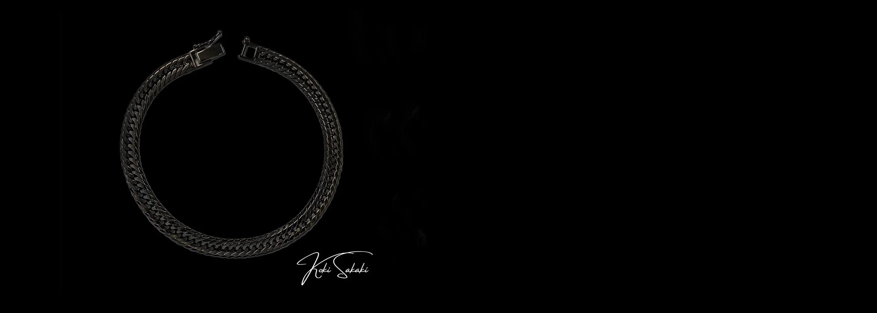 K18ブラック喜平を身に着けることで、黒い美しさを楽しめることはもちろん、時間と共にルテニウムの下からK18本来の輝きが徐々に顔を出し漆黒の黒と混ざり合う様子は、まるで日本人の心に宿る侘び寂びを尊ぶ心のような美しさを演出します。