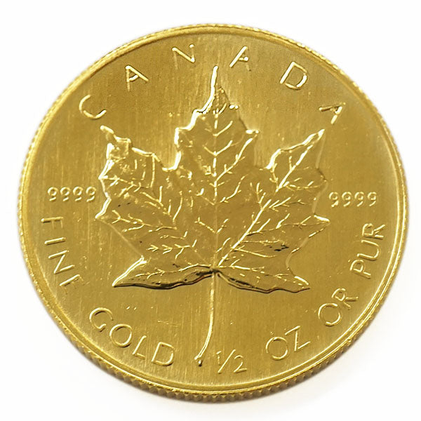 商品名 : 【中古AB/使用感小】 24金 メイプルリーフ 金貨 1/2オンス 1/2oz ランダムイヤー カナダ 地金 純金 K24 メープルリーフ コイン 硬貨 貨幣 20221116k24-1-2oz-cana-ab